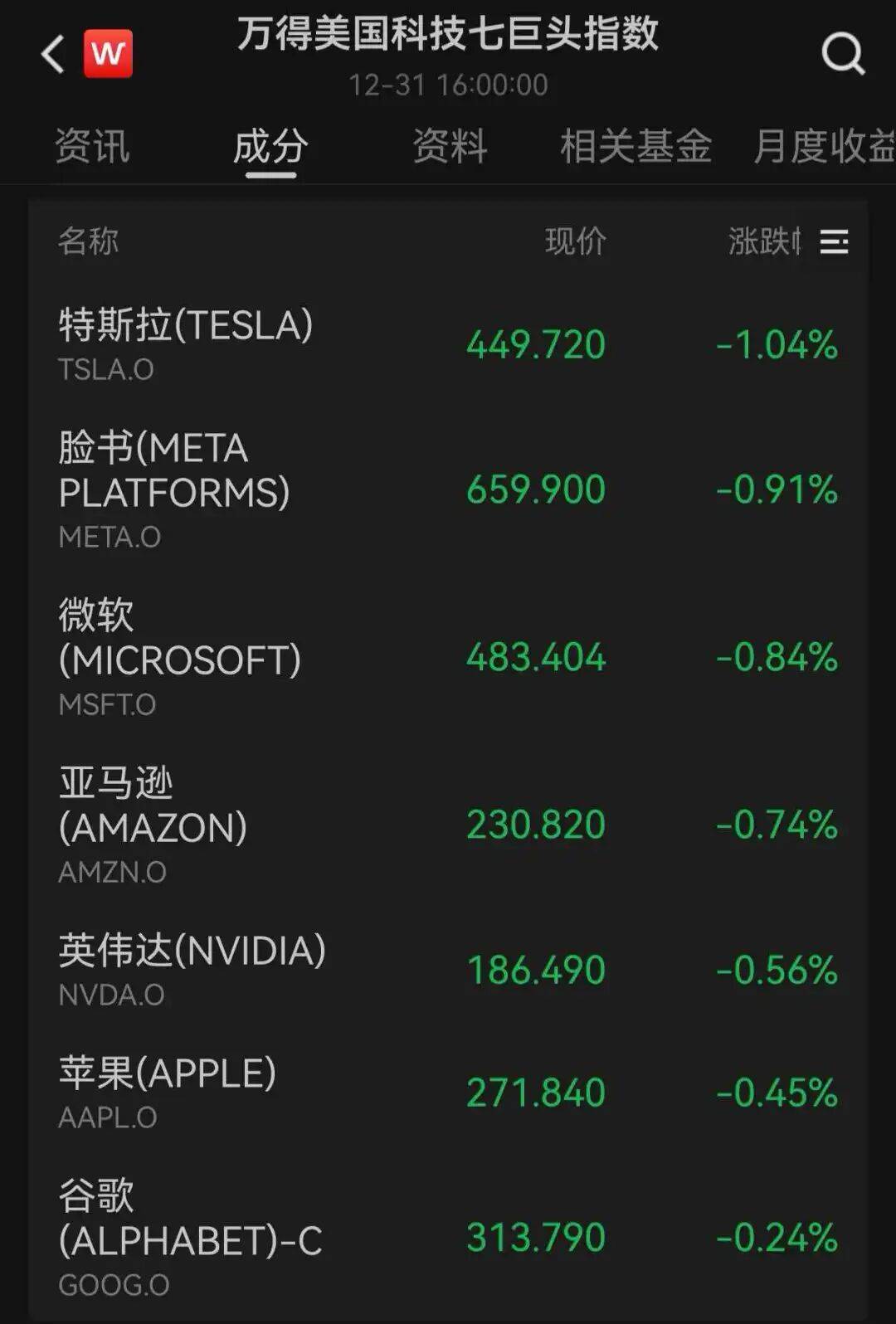 当地时间2025年12月31日,美股三大指数全线收跌。Wind数据显示,截至收盘,道琼斯工业指数跌0.63%,纳斯达克指数跌0.76%,标普500指数跌0.74%,均为四连跌。