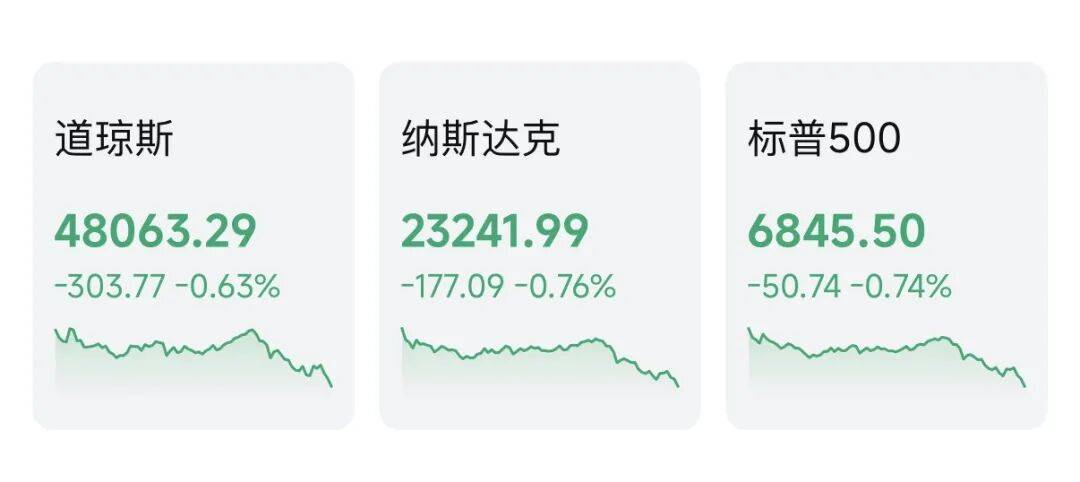 截至收盘,道指跌0.63%,报48063.29点;标普500指数跌0.74%,报6845.5点;纳指跌0.76%,报23241.99点,均录得四连跌。拉长时间来看,2025年全年,道指涨12.97%,标普500指数涨16.39%,纳指涨20.36%,均录得年线三连涨。