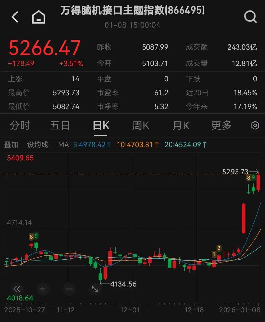 另一个大涨的板块是脑机接口,昨天稍微回调了下,今天又涨了3.5%,还真是马年要炒马斯克。