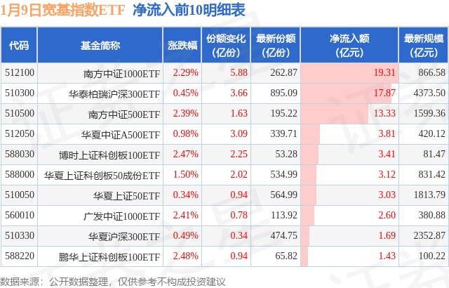 当日有39只宽基指数ETF基金出现资金净流入,其中净流入排首位的是南方中证1000ETF(512100),份额增加了5.88亿份,净流入额为19.31亿元。