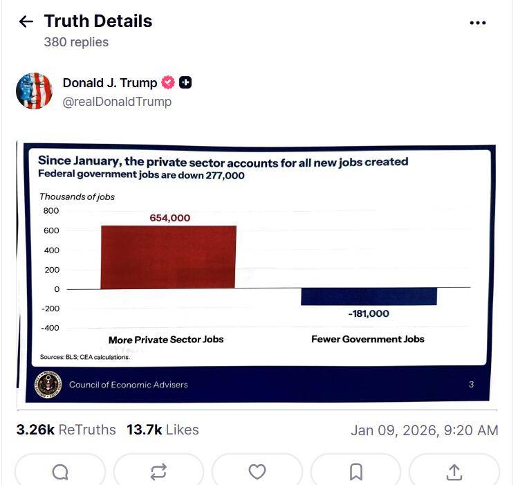 以下截图可见,特朗普公布的上述图表显示,自“1月以来”,美国的私人部门合计增加65.4万个工作岗位,政府部门的就业岗位净减少18.1万个。这与BLS周五公布的私人部门2025年新增就业人数完全吻合。该图表贴文发布比官方预定的发布时间早了约12小时,以图表发布的时间计算,特朗普应该至少提前12小时得到了周五才公之于众的12月就业数据,并提前半天将它曝光。