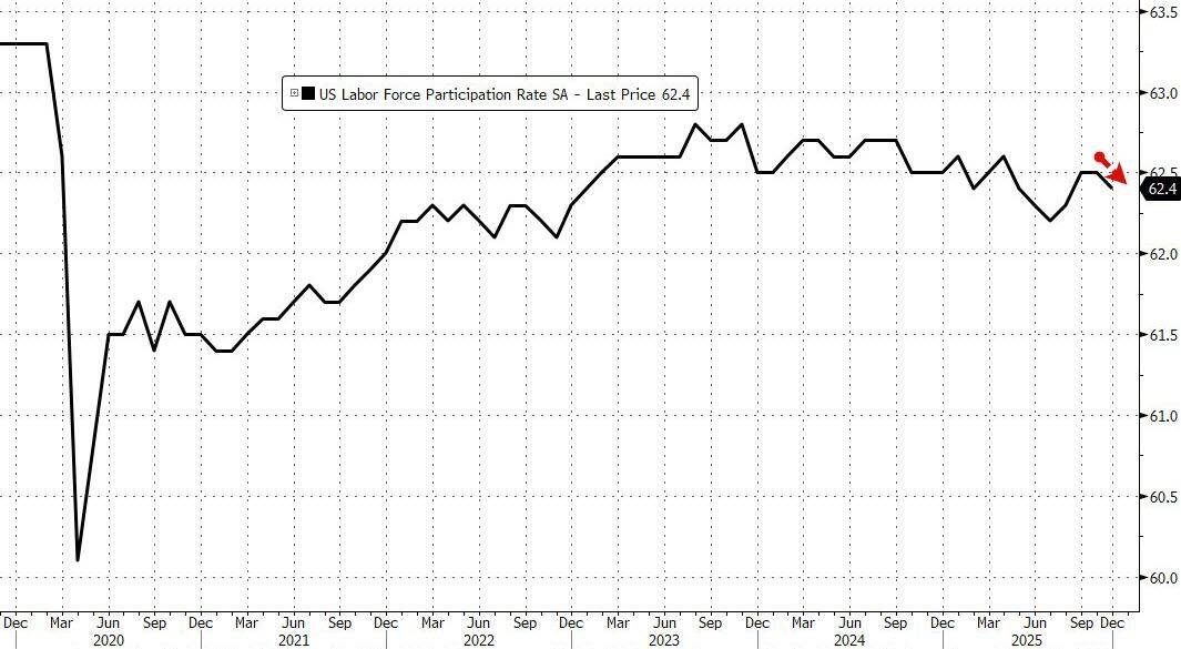 尽管就业增长疲软,12月失业率却从4.6%降至4.4%,重新回落至政府创纪录长时间关门前的水平。这一降幅部分归因于劳动力参与率下滑至62.4%,意味着部分失业者完全退出劳动力市场,不再被统计为“积极寻找工作”的人群。