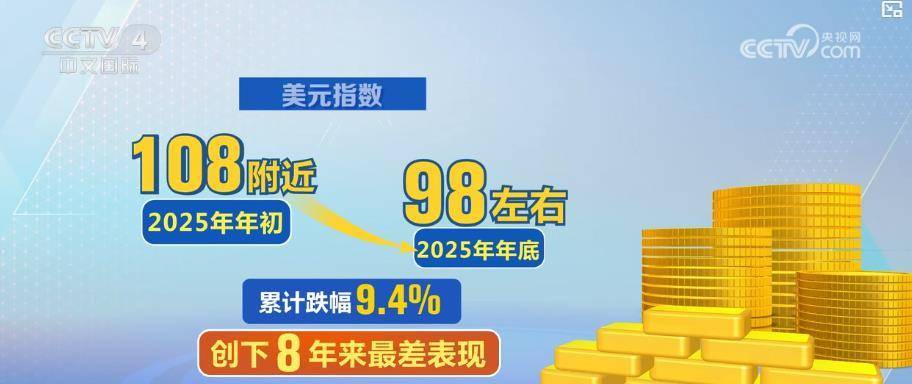 与之相反的是,美元指数从2025年年初的108附近,下跌到年底的98左右,累计跌幅9.4%,创下8年来最差表现。