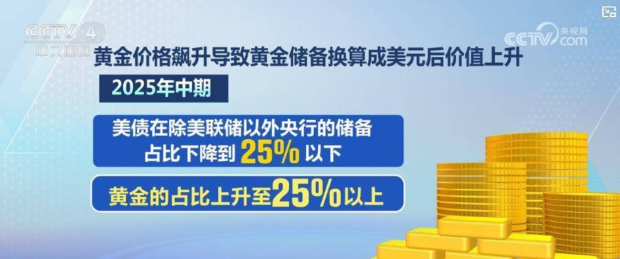 黄金价格飙升导致黄金储备换算成美元后价值上升。2025年中期,美债在除美联储以外央行的储备占比下降到25%以下,黄金的占比上升至25%以上。这是自1996年以来,黄金首次在各国央行储备中的占比超过美债。