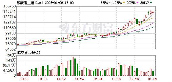期货反映市场预期,短期走势依然偏强。1月9日,主力合约碳酸锂2605收报14.34万元/吨,前一天曾逼近15万元/吨。