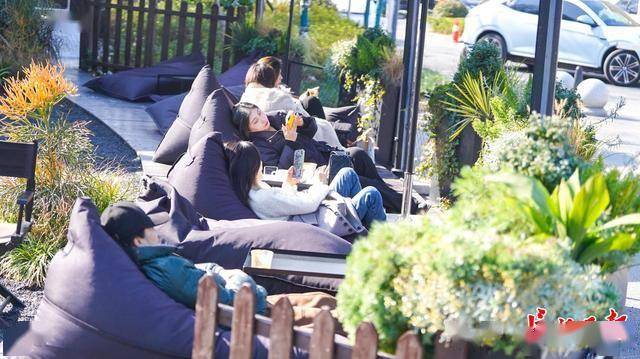 6日中午,一群年轻人躺在2号门一家咖啡馆晒太阳。记者李子云 摄