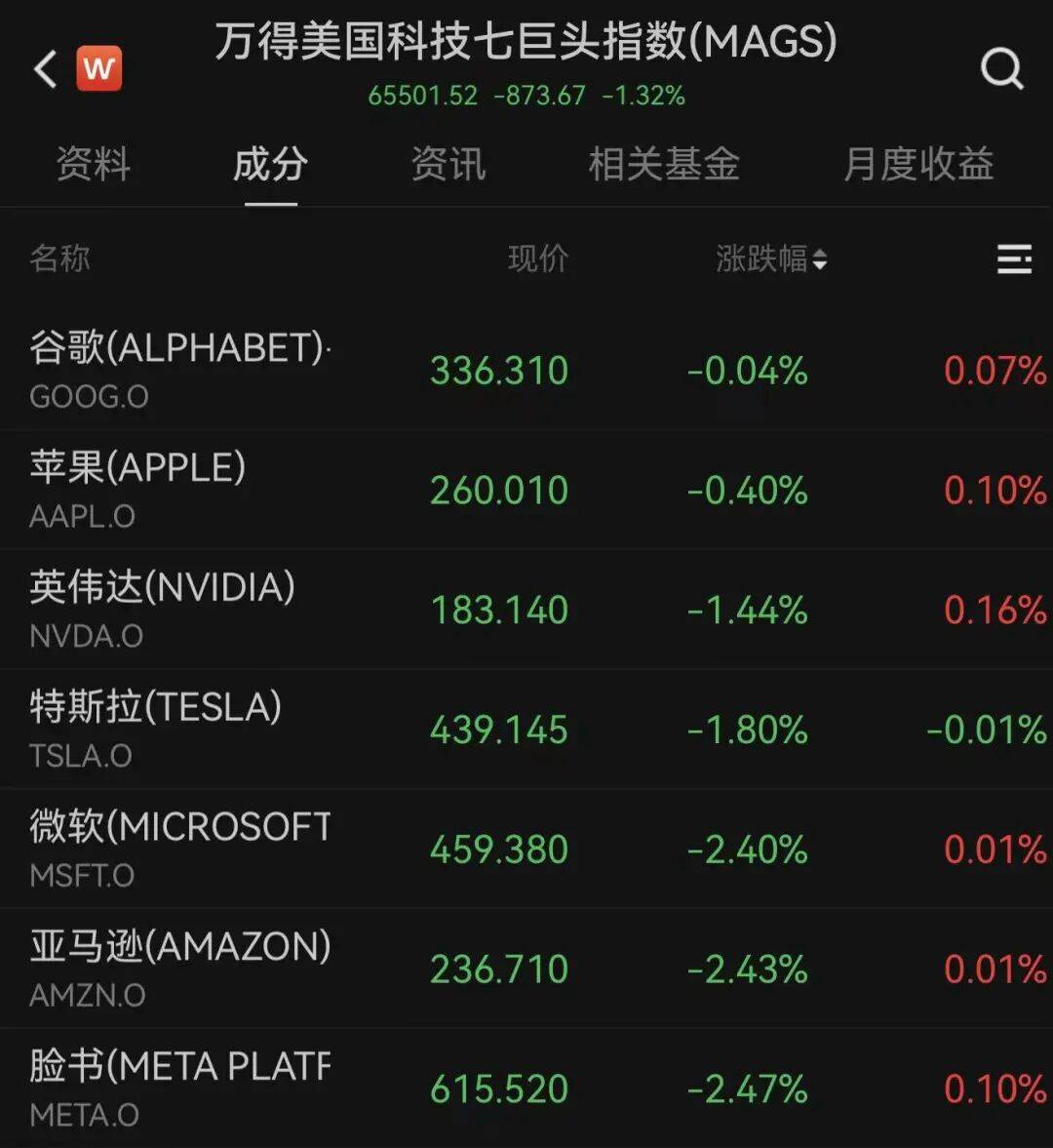 美股大型科技股全线下跌,万得美国科技七巨头指数下跌1.32%。Meta、亚马逊、微软跌超2%,特斯拉、英伟达跌超1%,苹果跌0.4%,谷歌跌0.04%。