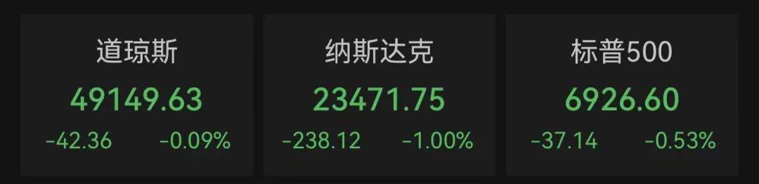 当地时间1月14日,美股三大指数集体收跌。道指跌0.09%,报49149.63点;标普500指数跌0.53%,报6926.6点;纳指跌1%,报23471.75点。