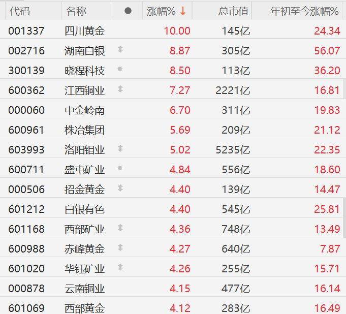 金银价格昨日再度创出历史新高,刺激A股市场相关概念股走强。其中,四川黄金涨停,湖南白银、晓程科技涨超8%,江西铜业涨超7%,中金岭南涨超6%,株冶集团、洛阳钼业涨超5%,盛屯矿业、招金黄金、白银有色、西部矿业、赤峰黄金、华钰矿业、云南铜业、西部黄金涨超4%。消息面上,现货黄金一度涨至4643美元/盎司,创历史新高;现货白银一度突破93美元/盎司,再创历史新高。