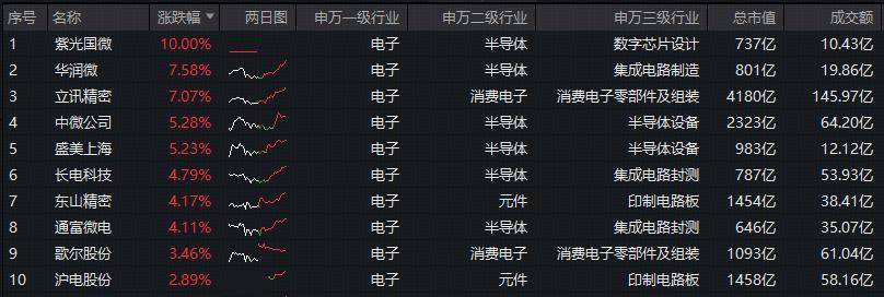 细分方向来看,半导体龙头领涨,紫光国微一字涨停,华润微涨超7%;消费电子龙头方面,立讯精密涨超7%,歌尔股份涨逾3%;PCB(印制电路板)龙头方面,东山精密涨超4%,沪电股份、生益科技涨逾2%。