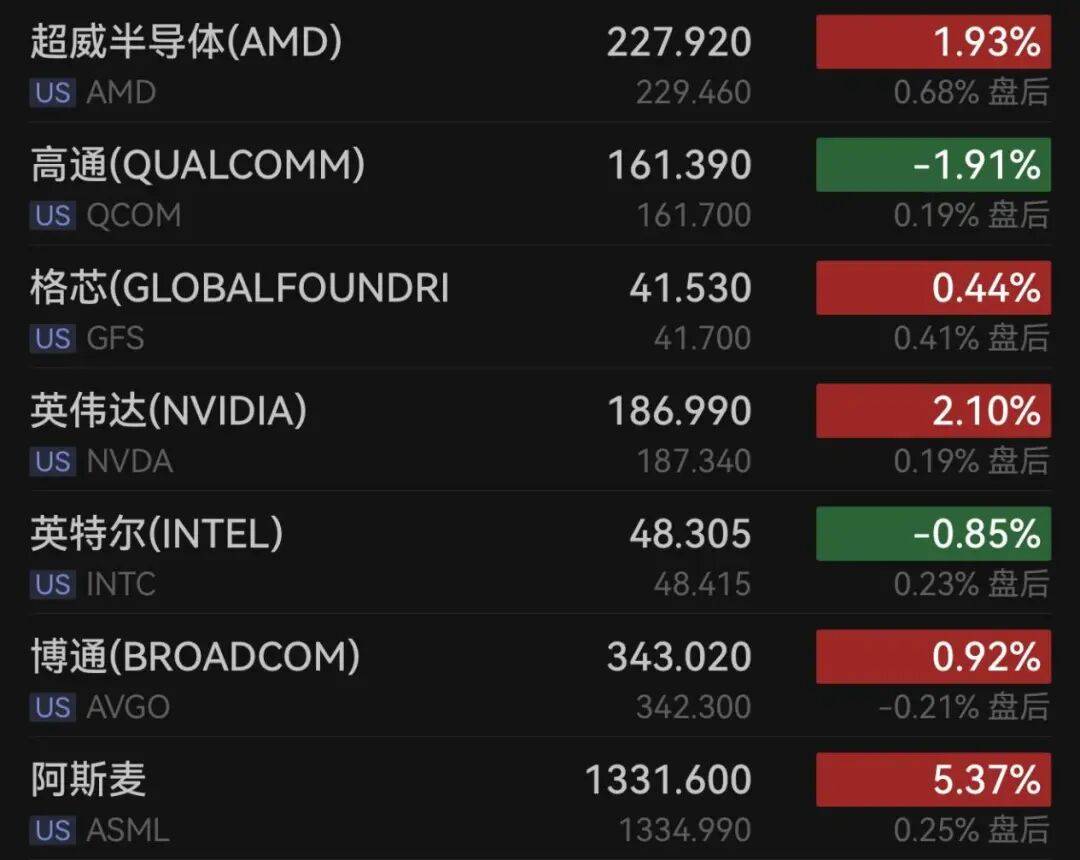 芯片股多数上涨,费城半导体指数涨1.76%,刷新历史新高。科天半导体涨超7%,应用材料涨逾5%,阿斯麦涨超5%,台积电涨逾4%,超微半导体涨近2%。跌幅方面,德州仪器跌超2%,高通跌逾1%,迈威尔科技跌超1%。