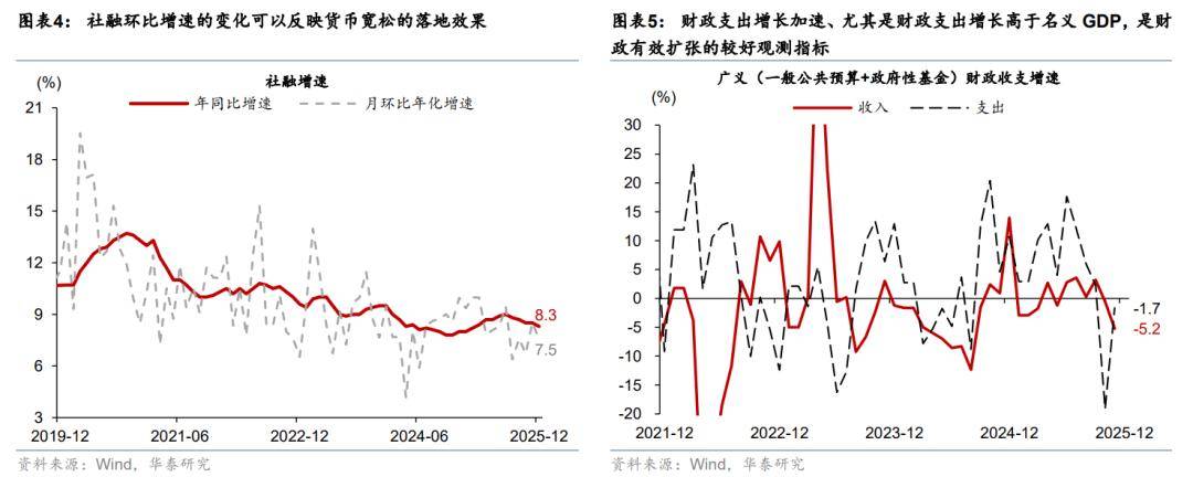 我们重申财政政策的空间和稳增长效用可能大于货币政策,但货币政策适当扩张有助于财政宽松的顺利推进。如我们在《财政能否助力“开门红”?》(2025/12/28)中分析,2021下半年地产去杠杆以来,广义财政支出强度与内需周期的同步性明显上升,财政支撑成为内需增长的(最)重要动力之一。然而,正如此次新闻发布会所强调的,货币政策保持适度宽松,与财政政策协同配合,将进一步放大政策效能。