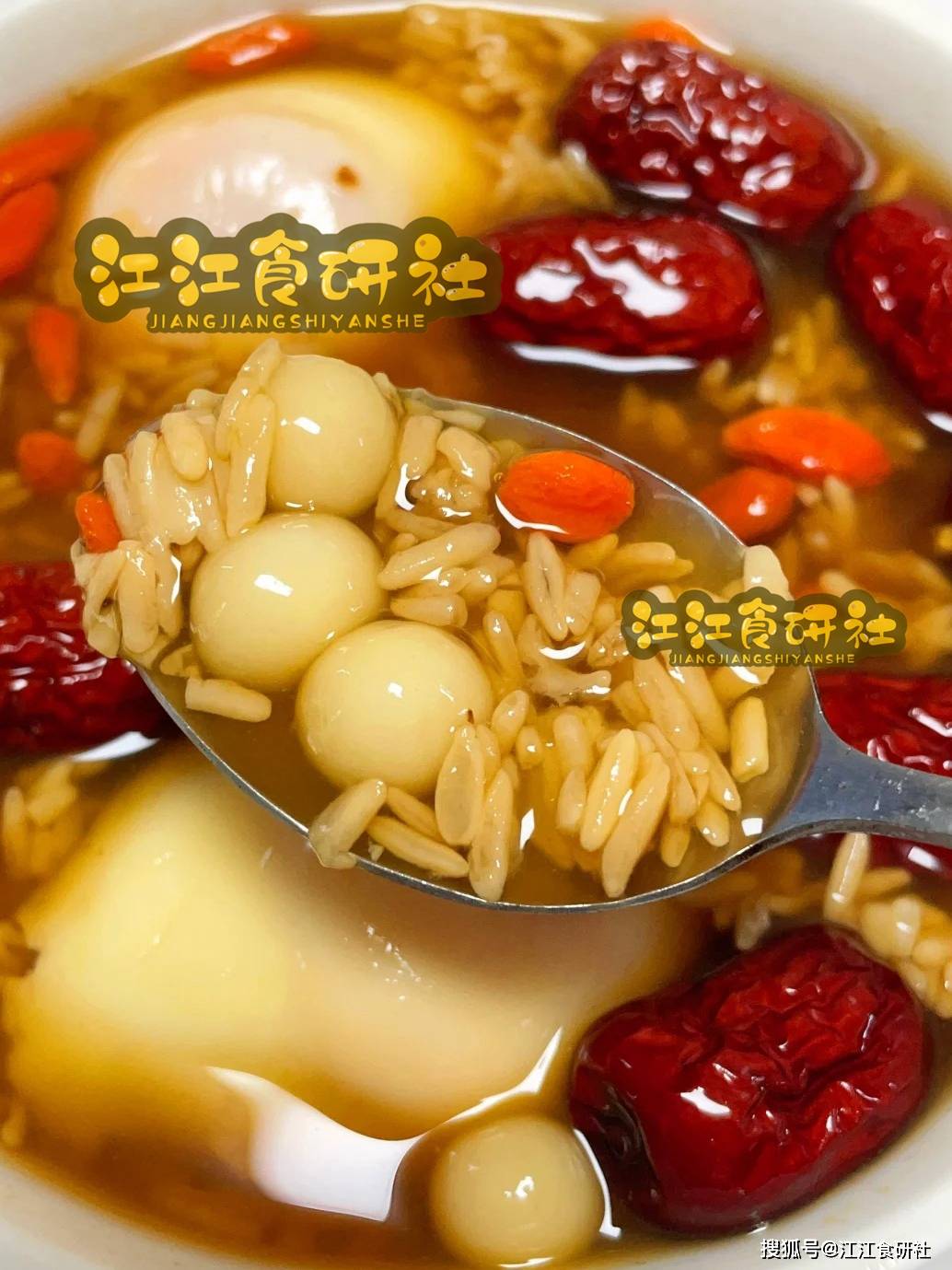 红枣4-5颗,用剪刀剪开去核(这样不易上火)。枸杞一小撮,洗净。酒酿(醪糟)3大勺,这是香气的灵魂。红糖,根据喜好,一到两块。