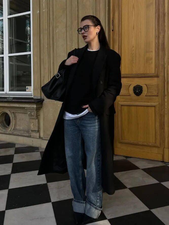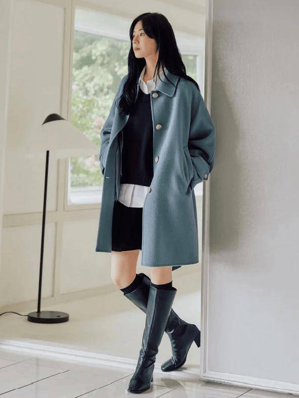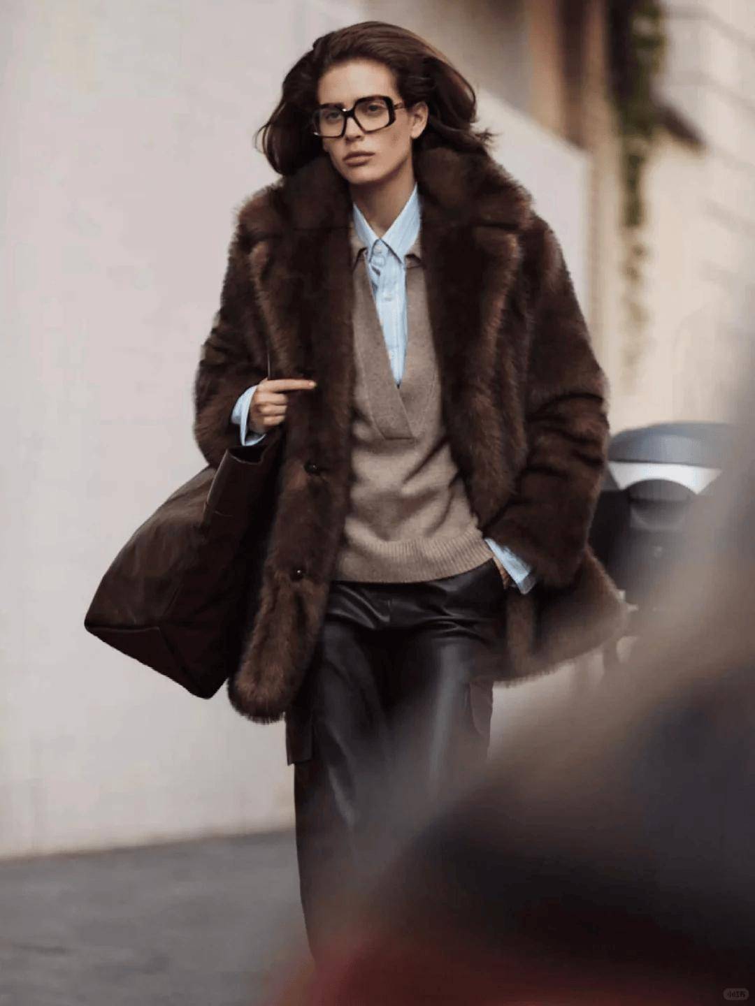 以 「衬衫+针织衫+大衣」为基底模板,通过V领叠穿法打造视觉延伸感。选择精纺羊绒内搭作贴肤层,中叠高领针织衫时解开衬衫顶扣,让领口自然形成三角区,外搭廓形羊毛大衣时将下摆微露1-2cm,既避免臃肿又增添动态美感。职场场景可尝试灰蓝衬衫叠米白针织背心,外披驼色双面呢大衣,同色系渐变法则让通勤穿搭更显高级。