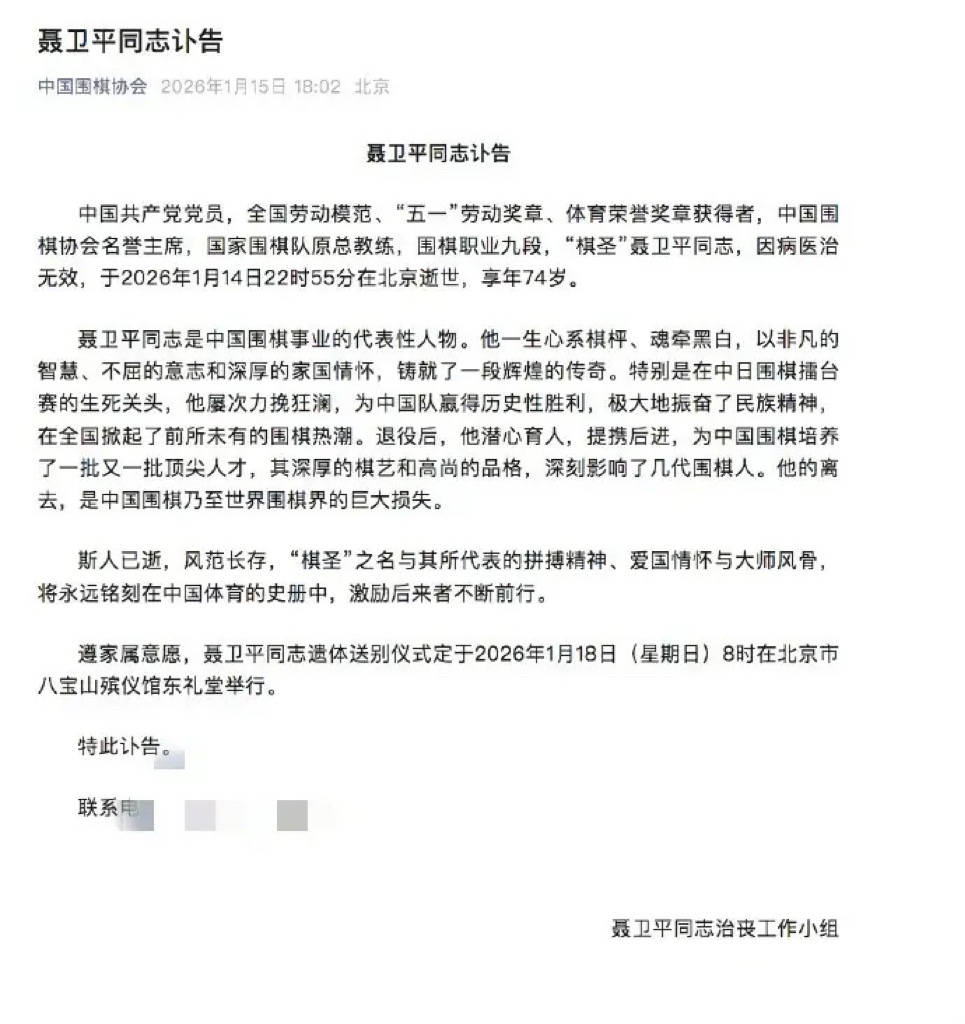 围棋协会发讣告,遵家属意愿,聂卫平同志遗体告别仪式定于2026年1月18日8时,在北京市八宝山殡仪馆东礼堂举行。