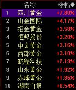 早盘,贵金属板块表现活跃。四川黄金早盘一度逼近涨停,截至发稿涨7.8%,山金国际涨超4%,招金黄金、中金黄金、西部黄金、恒邦股份涨超3%。