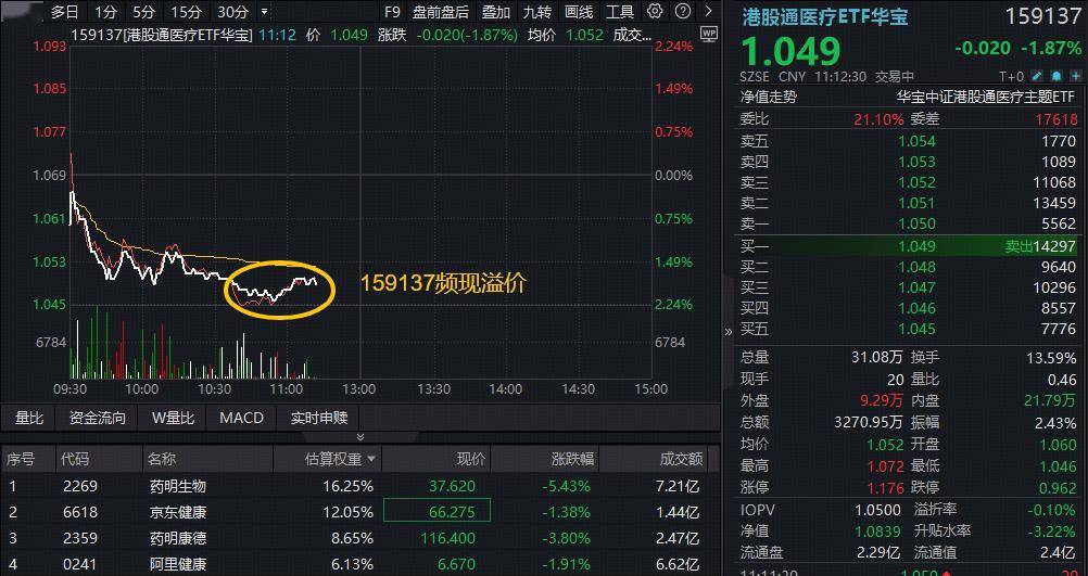 医疗板块低开低走,港股通医疗ETF华宝(159137)一度跌2%频现溢价,权重股药明生物跌超5%,AI医疗龙头京东健康、阿里健康双双跌逾1%。
