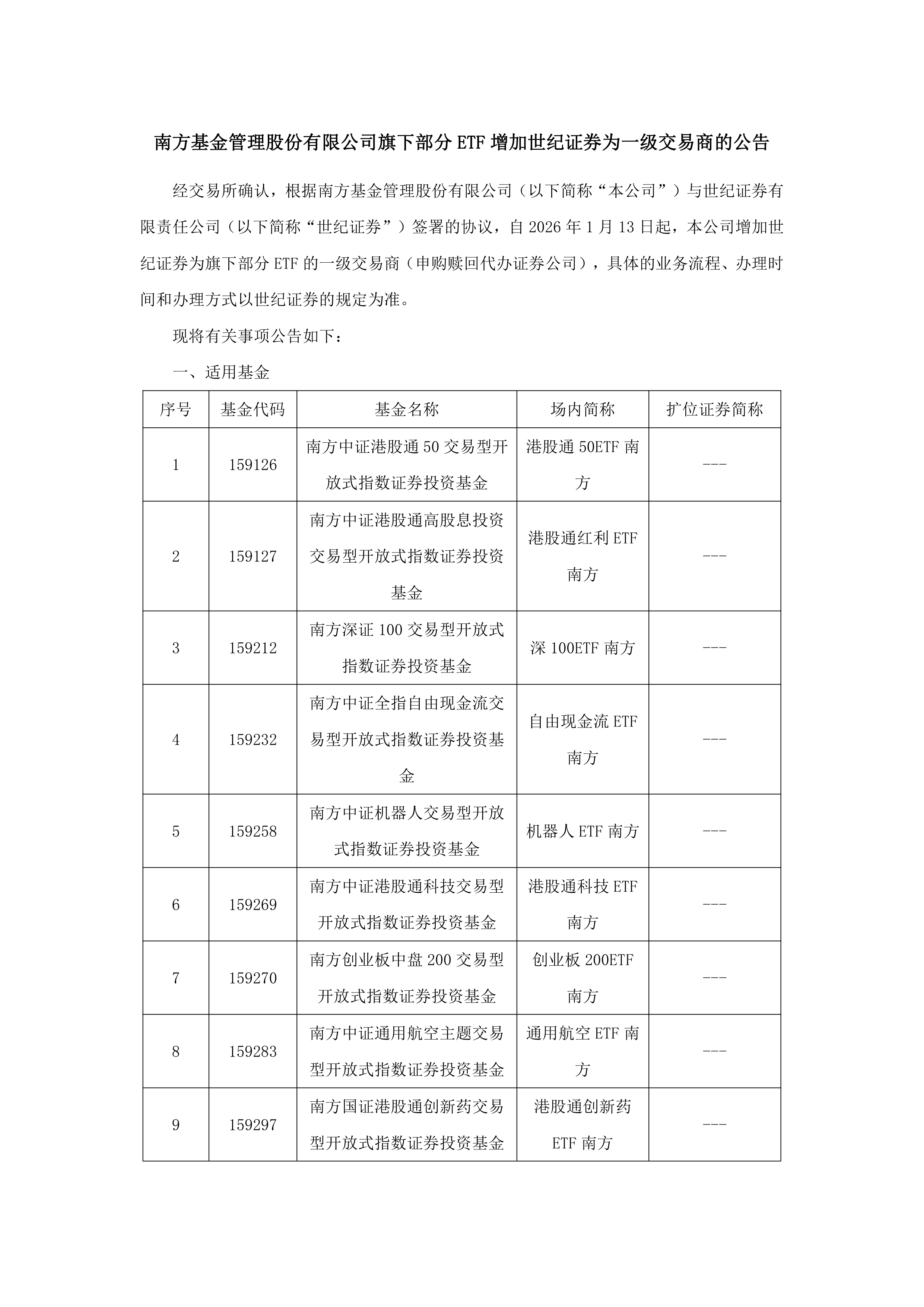 基金-香港科技ETF南方-南方基金管理股份有限公司旗下部分ETF增加世纪证券为一级交易商的公告