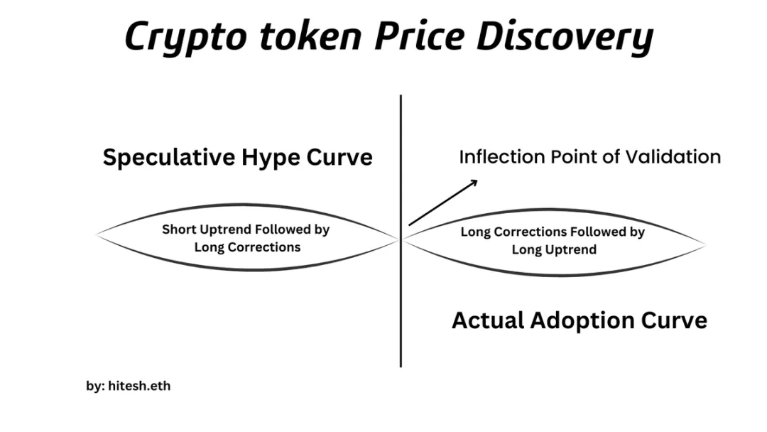 无论宣传叙事多么天花乱坠,所有加密代币都遵循着相同的价格发现周期。周期始于「0–1 阶段」:此时炒作占据绝对主导,实际应用率几乎为零。价格仅凭市场情绪一路飙升,社群围绕着虚构的「未来蓝图」形成,宣传话术的声势彻底盖过现实。随后,残酷的回调如期而至 — — 这会淘汰掉意志不坚定的持有者,也会揭穿那些只凭一句「承诺」就盲目入场的投资者。