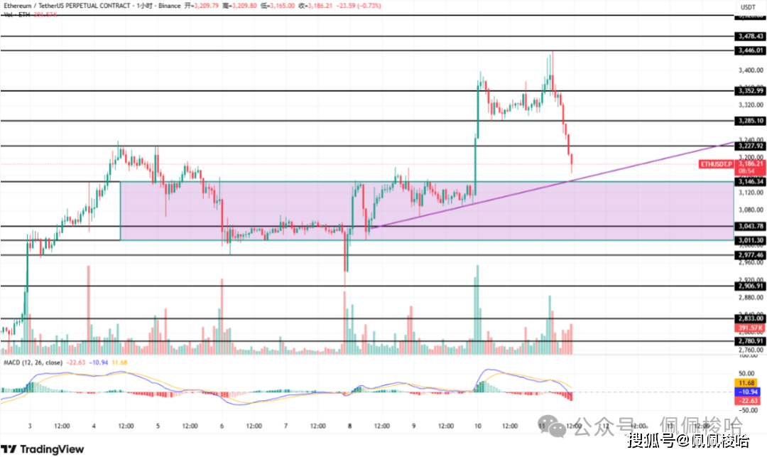 ETH在3146有趋势线和支持共振;按照当下行情ETH并没有回调到位有进一步以回调风险;右侧等待跌破3146回抽上方顺势做多吃个反弹,防守3067,目标3225和3285。