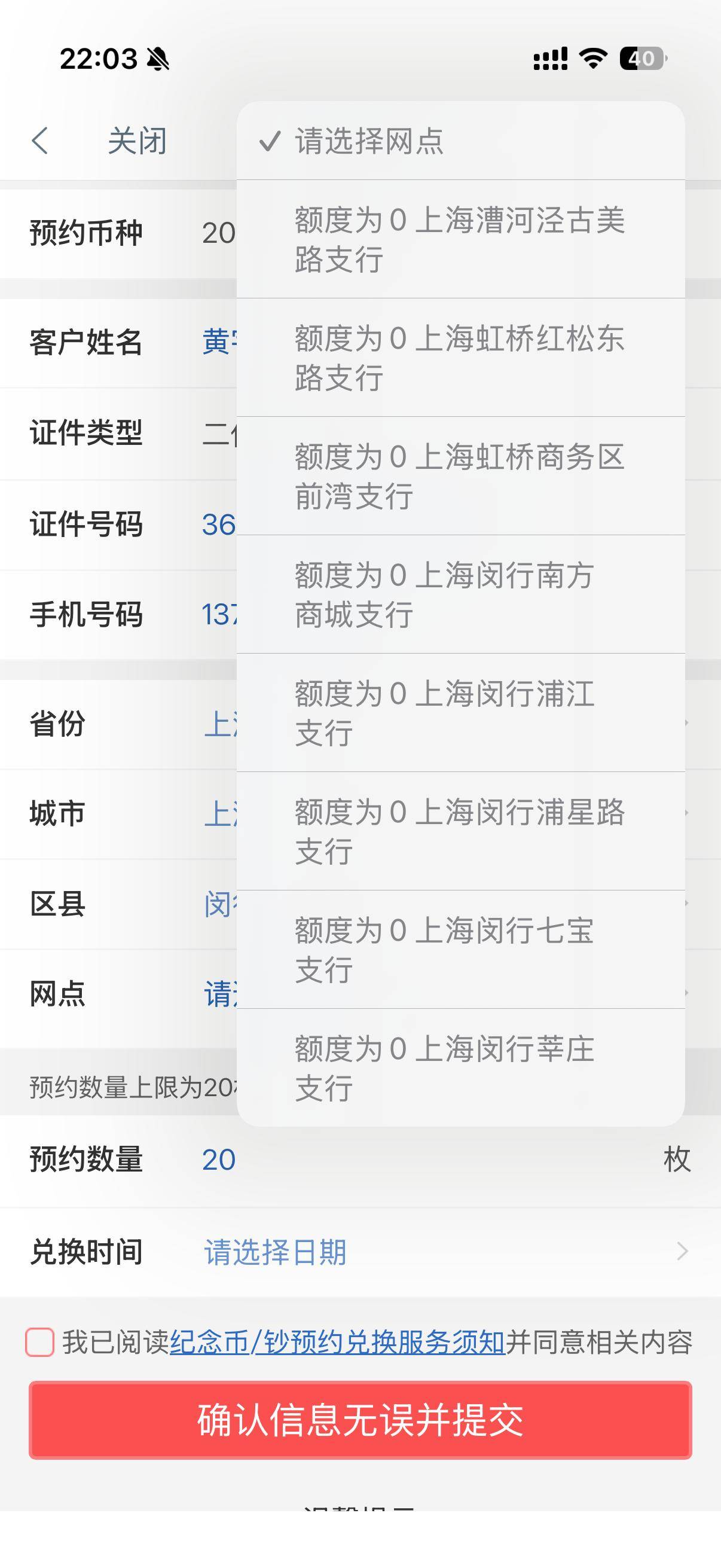 1月13日晚上10点,时代周报记者提前“蹲守”在工商银行App的纪念币预约界面,到点后立刻点击预约,但一直处在加载页面,重新刷新后进入填写信息页面,但仅1分钟左右,上海各网点预约额度便显示已空,随后时代周报记者又以同样方式预约马年纪念钞,情况也同样如此。