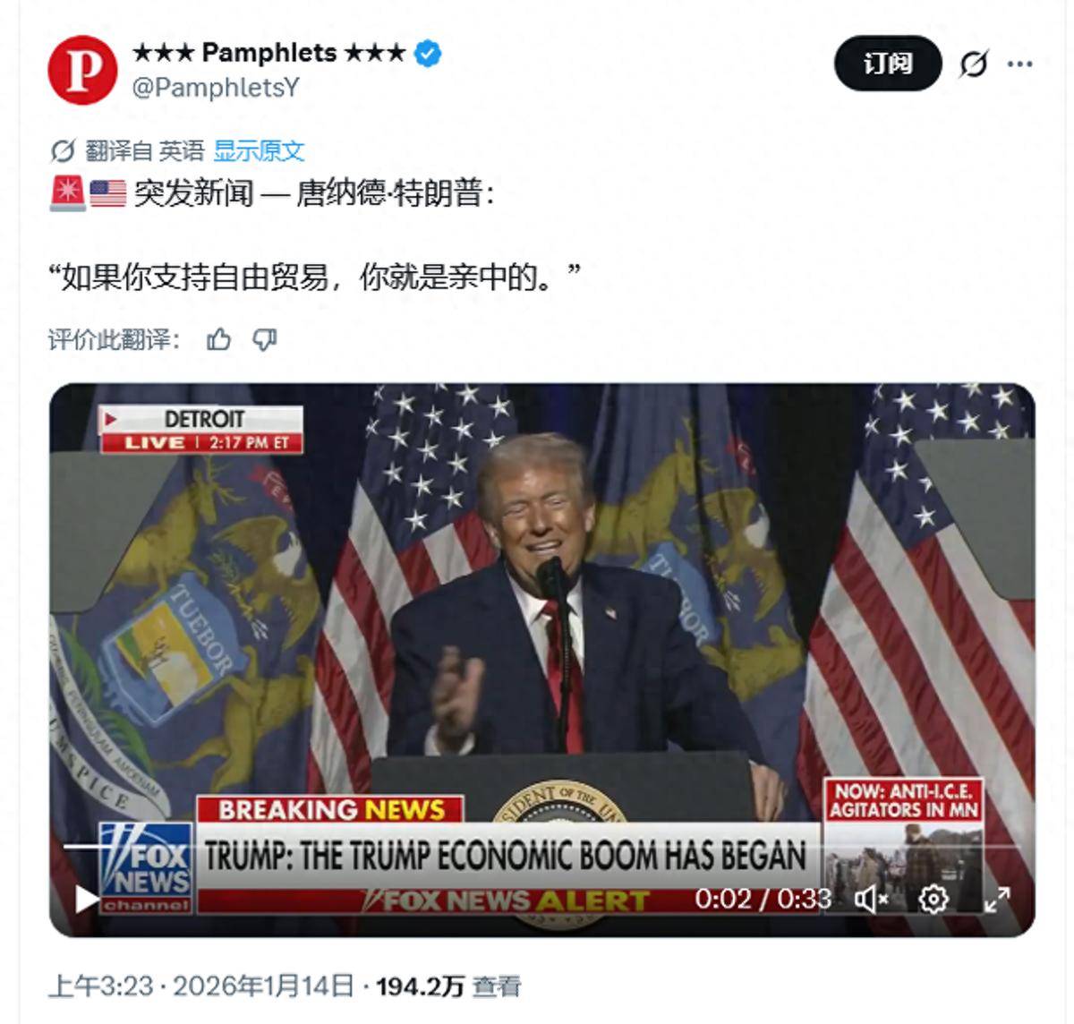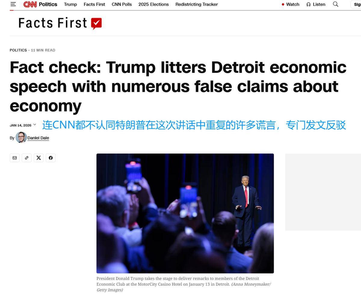 这句话被普遍理解为如果你支持自由贸易,那么你就是特朗普眼中的亲华派,这几乎相当于特朗普为中国成为全球自由贸易的主力军盖了一个官方印章。对于特朗普的这番话,海外网友普遍表示嘲笑。大部分人认为,特朗普的倒行逆施不仅会对美国经济带来伤害,还将让中国在全球经济舞台上获得更多的利益。特朗普说这番话的背景,是美国最高法院开始审理特朗普政府广泛使用关税大棒的合法性问题。他辩解道,最高法院如果裁定其关税政策无效,将会伤害美国经济,而反对关税的人,实际上是在帮助中国经济的利益。在底特律的访问期间,他甚至将美国-墨西哥-加拿大协议(USMCA)称作无关紧要,并宣称要推动更多制造业回流美国。美国CNN网站还专门发表文章,批驳特朗普在底特律演讲中的经济言论,指出其中充斥着大量谎言,并进行了事实核查。举个例子,特朗普声称中国是最大的关税支付者,但实际上,美国政府对中国出口商品征收的关税,大多数是由美国进口商和消费者承担的。显然,即使在美国,也有很多民众对特朗普的关税政策表示强烈反对。