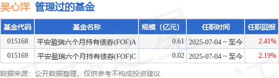 吴心洋先生:中国国籍,南京大学环境科学学士,华中科技大学金融学硕士,历任长信基金管理有限责任公司产品经理、西部利得基金管理有限公司产品经理、华泰证券(上海)资产管理有限公司产品经理。2022年6月加入平安基金管理有限公司,曾担任FOF研究员、投资经理,2025年07月04日担任平安盈瑞六个月持有期债券型基金中基金(FOF)基金经理。