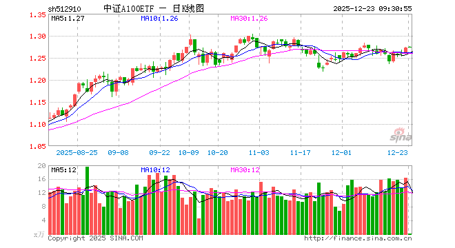 12月23日,中证A100ETF(512910)开盘涨0.16%,报1.275元。中证A100ETF(512910)重仓股方面,宁德时代开盘涨0.04%,贵州茅台涨0.00%,中国平安涨0.03%,招商银行跌0.07%,紫金矿业涨1.63%,中际旭创涨1.21%,美的集团涨0.28%,长江电力跌0.15%,兴业银行涨0.33%,立讯精密跌0.31%。