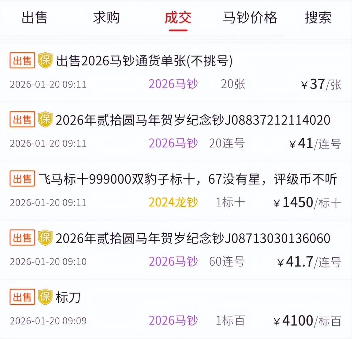马年纪念钞通货成交价在37到42元之间。