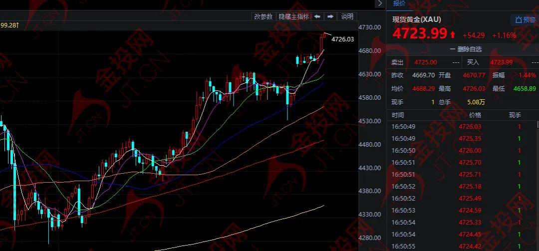 隔夜,受助于避险需求,现货金银双双创下纪录新高,现货黄金一度触及4690美元,最终收涨1.64%,报4670.76美元;现货白银最终收涨4.69%,报94.30美元。今日欧市盘中,黄金再创新高,继续暴涨至4731.32美元,目前在4724美元附近徘徊。