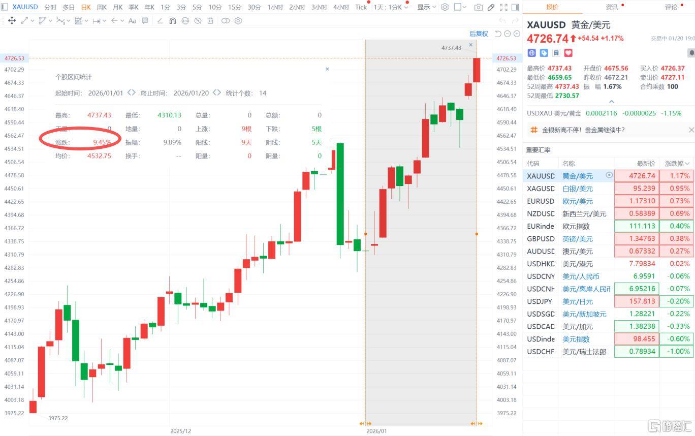 现货黄金遥遥直上一度突破4730美元/盎司,现涨117%;纽约期金站上4740美元/盎司,日内涨3.17%。