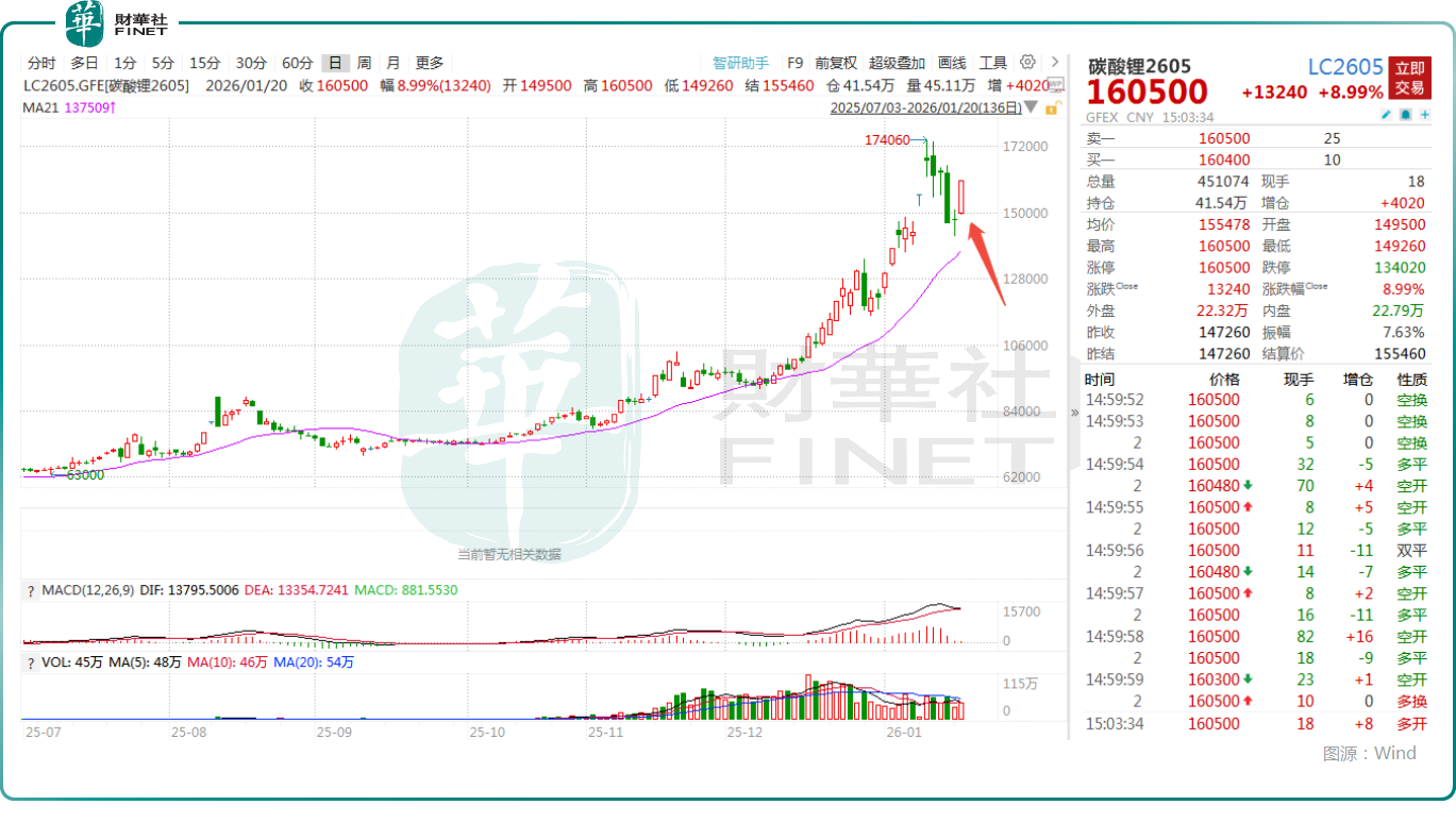 1月20日,碳酸锂期货单日再度飙升8.99%,强势涨停,成交量较前一个交易日也出现明显放大,如下图所示。