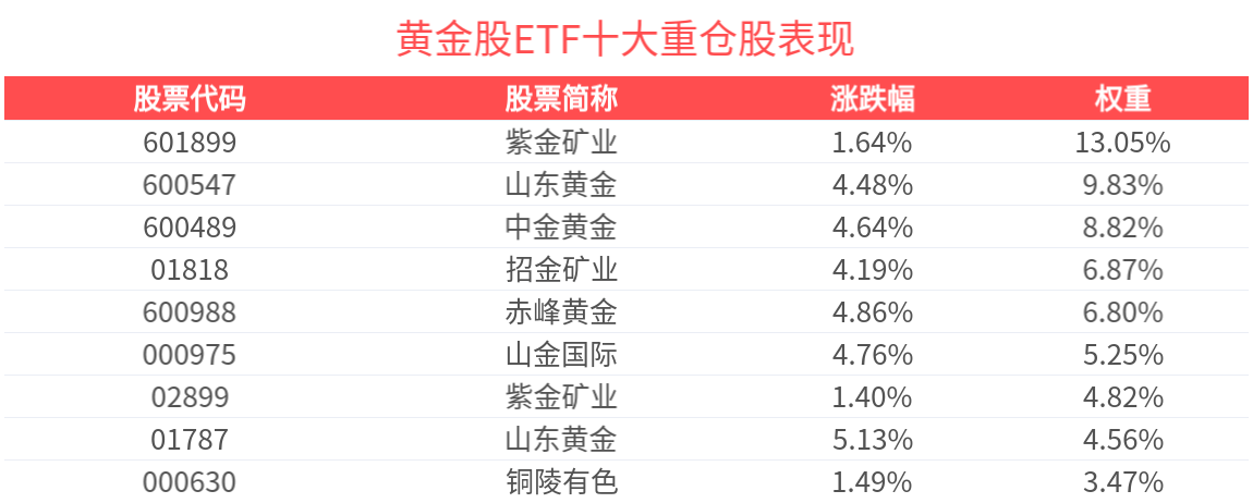 黄金股ETF紧密跟踪中证沪深港黄金产业股票指数,覆盖黄金采掘、冶炼、销售的黄金产业链相关个股。截至2025年12月31日,中证沪深港黄金产业股票指数(931238)前十大权重股分别为紫金矿业、山东黄金、中金黄金、赤峰黄金、招金矿业、山金国际、山东黄金、紫金矿业、紫金黄金国际、湖南黄金,前十大权重股合计占比63.58%。(以上所列股票仅为指数成份股,无特定推荐之意)