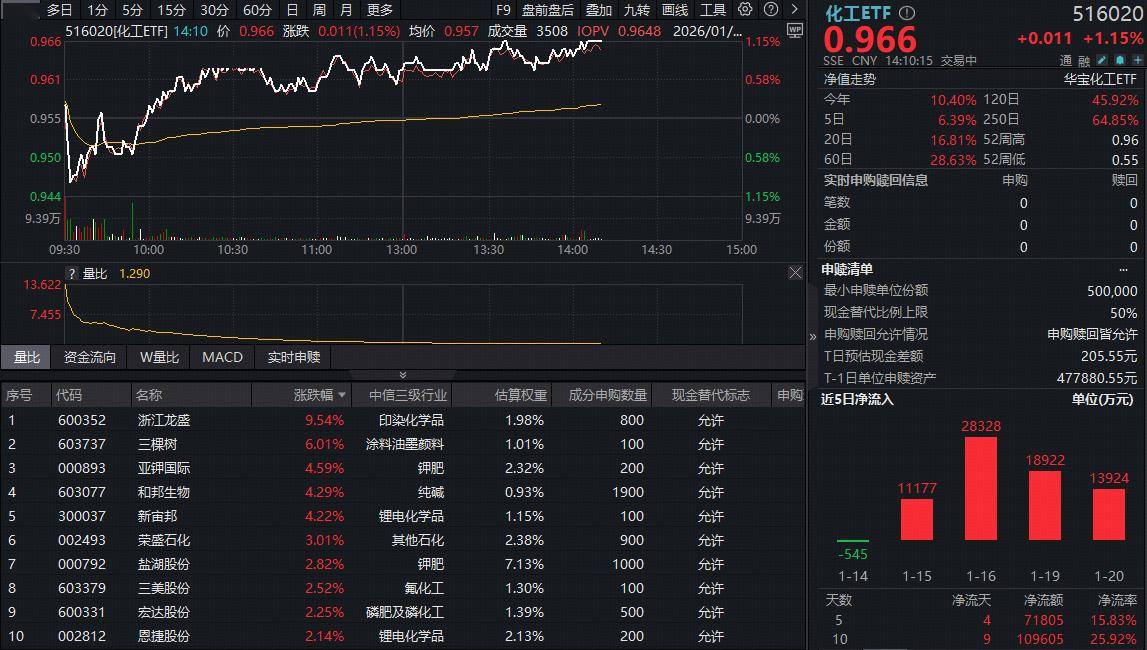 化工板块攻势不停!反映化工板块整体走势的化工ETF(516020)早盘走弱后迅速拉升翻红,而后持续高位震荡,截至发稿,场内价格涨1.15%,冲击日线三连阳。