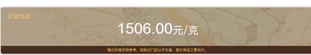 目前,中国黄金足金饰品价格已突破1500元,报1506元/克。其中,老凤祥足金饰品报1498元/克,较1月20日1456元/克涨42元/克。