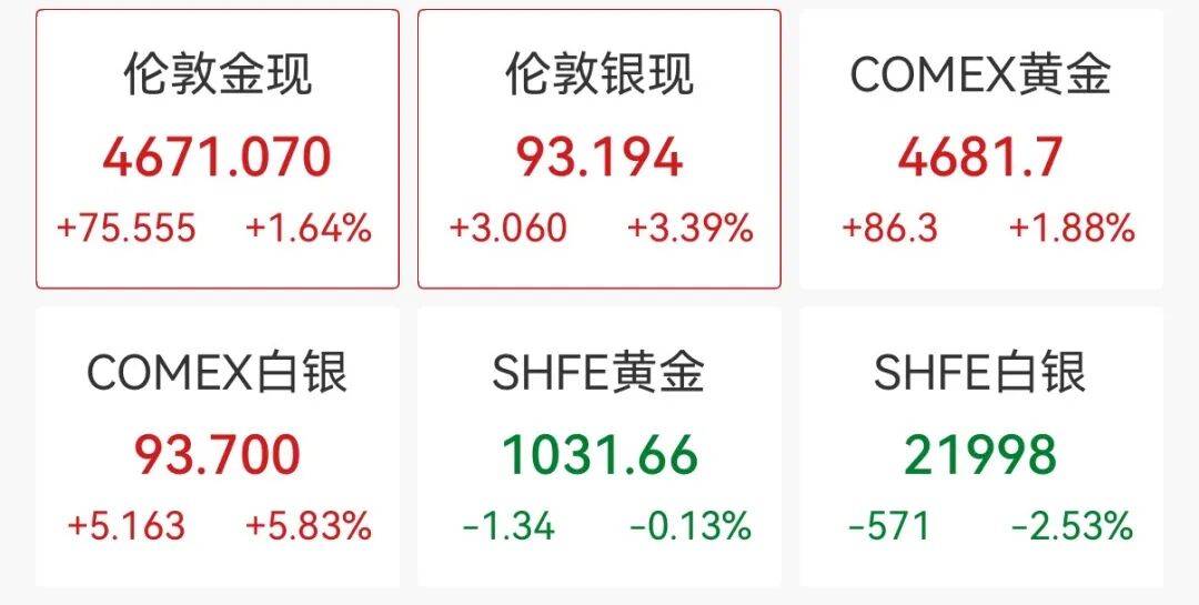 截至发稿,伦敦金现涨1.64%报4671.07美元/盎司,伦敦银现涨3.39%报93.194美元/盎司;COMEX黄金涨1.88%报4681.7美元/盎司,COMEX白银涨5.83%报93.7美元/盎司。