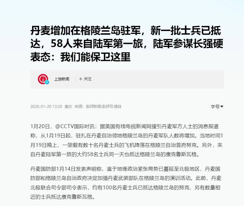 信息来源:丹麦增加在格陵兰岛驻军,新一批士兵已抵达,58人来自陆军第一旅,陆军参谋长强硬表态:我们能保卫这里