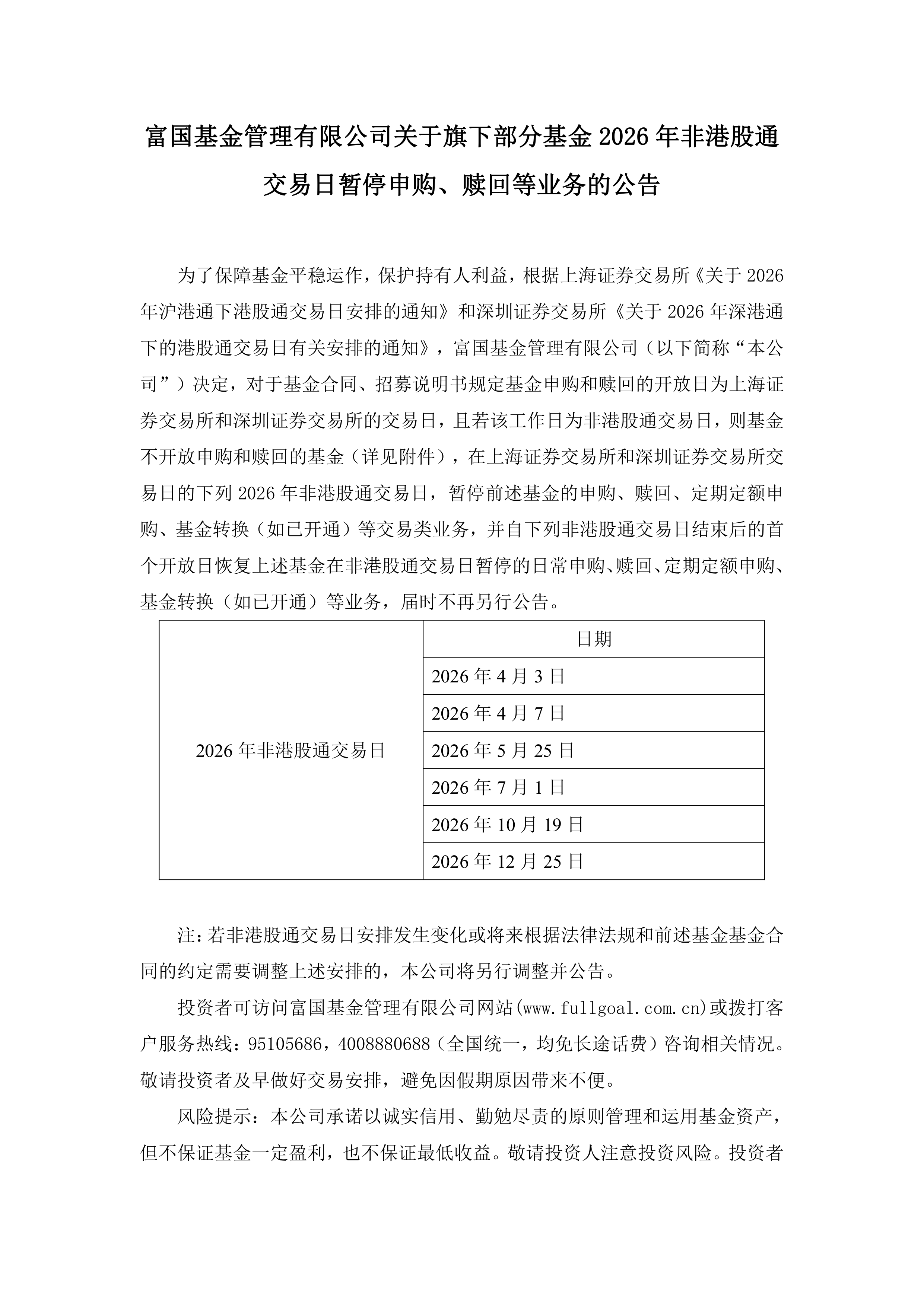 基金-港股通红利ETF富国-富国基金管理有限公司关于旗下部分基金2026年非港股通交易日暂停申购、赎回等业务的公告