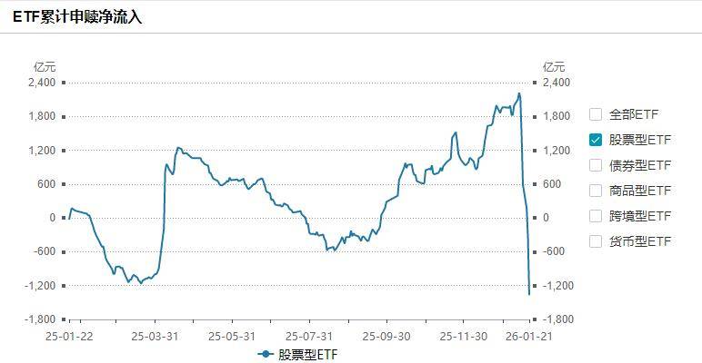 虽然知道昨天gjd卖出ETF的量比较大,但早上起来一看还是吓到了,单日净卖出超过1000亿,五个交易日总计卖出超过3500亿,这导致近一年股票型ETF从净流入超过2200亿到净卖出超过1300亿。