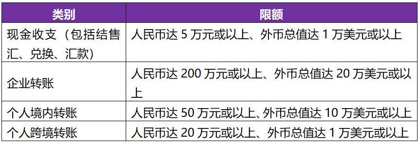 [1]《关于非银行支付机构开展大额交易报告工作有关要求的通知》第2条:非银行支付机构应当以客户为单位,按资金收入或者支出单边累计计算并报告下列大额交易:(一)当日单笔或者累计交易额人民币5万元以上(含5万元)、外币等值1万美元以上(含1万美元)的现金收支。(二)非自然人客户支付账户与其他账户发生当日单笔或者累计交易额人民币200万元以上(含200万元)、外币等值20万美元以上(含20万美元)的款项划转。(三)自然人客户支付账户与其他账户发生当日单笔或者累计交易额人民币50万元以上(含50万元)、外币等值10万美元以上(含10万美元)的境内款项划转。(四)自然人客户支付账户与其他的银行账户发生当日单笔或者累计交易额人民币20万元以上(含20万元)、外币等值1万美元以上(含1万美元)的跨境款项划转。中国人民银行根据需要可以调整大额交易报告标准。)