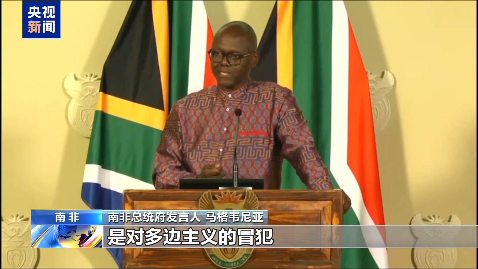 总台记者 赵祎楠:近日,美国表示美国决定在2026年担任二十国集团轮值主席国期间不邀请南非参会,对此南非总统府做出了最新的正面表态,南非强调南非是二十国集团的创始成员,美国的这一做法违背了多边主义原则。