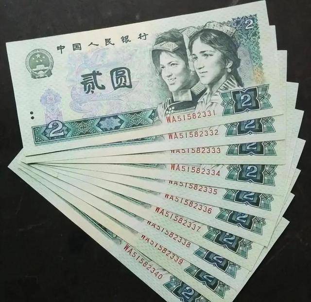 现在2元纸币成了收藏品,1980年版的2元绿钞票,品相好的,市场价已经翻了好几倍。1990年版的也在涨。越来越少,越来越值钱。