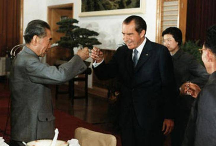 1972年2月21日,在飞机上,尼克松紧张地做着准备。他反复练习着握手的动作,嘴里还念叨着:“可不能失礼,一定要让这次握手完美。”