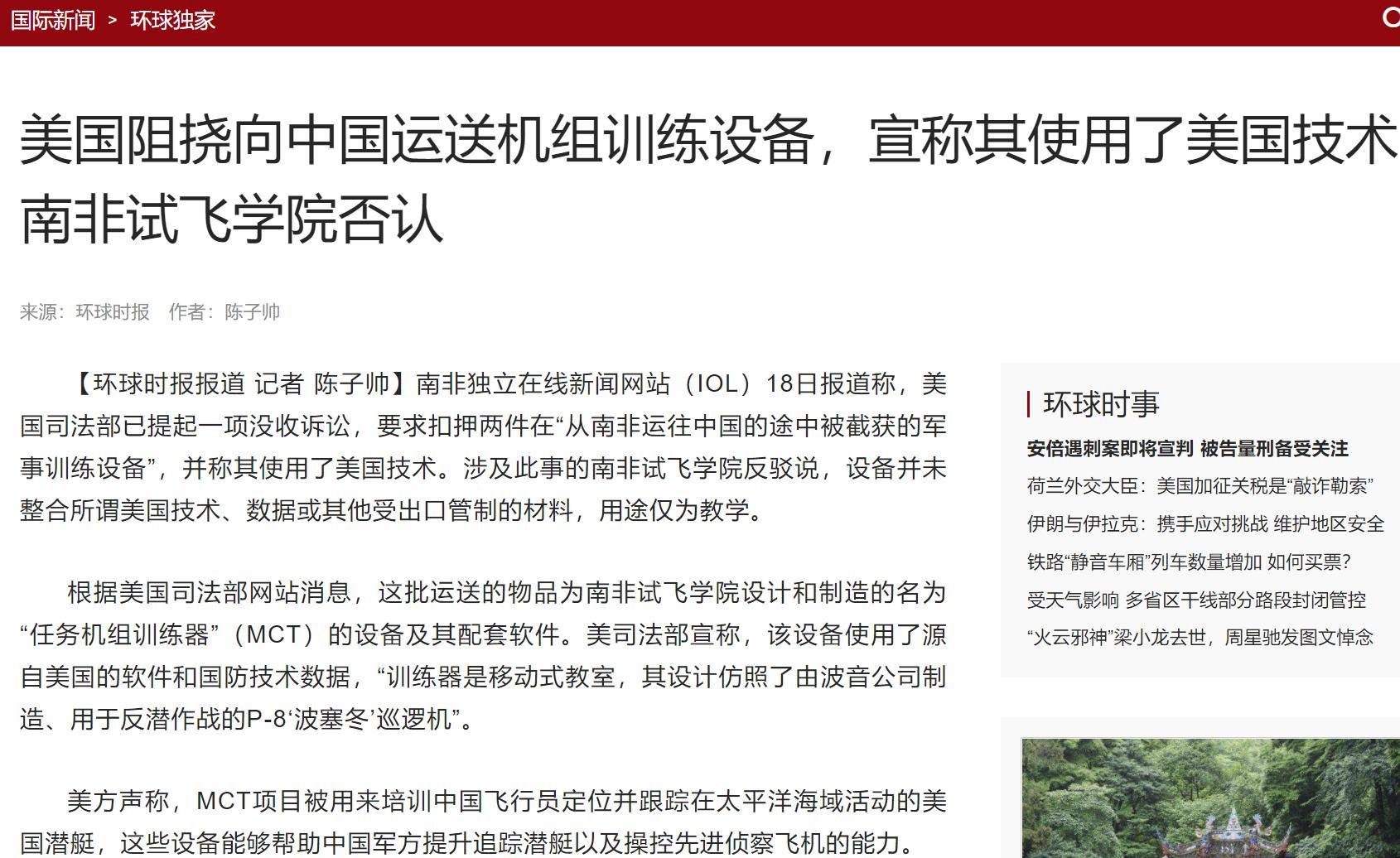 事情的起因是这样的。根据《环球时报》援引南非方面的消息,美国司法部突然发难,要求南非方面截获并扣押两件正准备运往中国的任务机组训练器。美国给出的理由听起来似乎非常正义,他们声称这两件设备将被用于军事用途,且里面包含了美国的技术,一旦被中国得到,将对美军构成威胁。更甚者,美方还信誓旦旦地表示,这些设备模仿的是美国海军的P-8A反潜巡逻机,其核心技术就是美国的,因此他们有权对其进行干预。