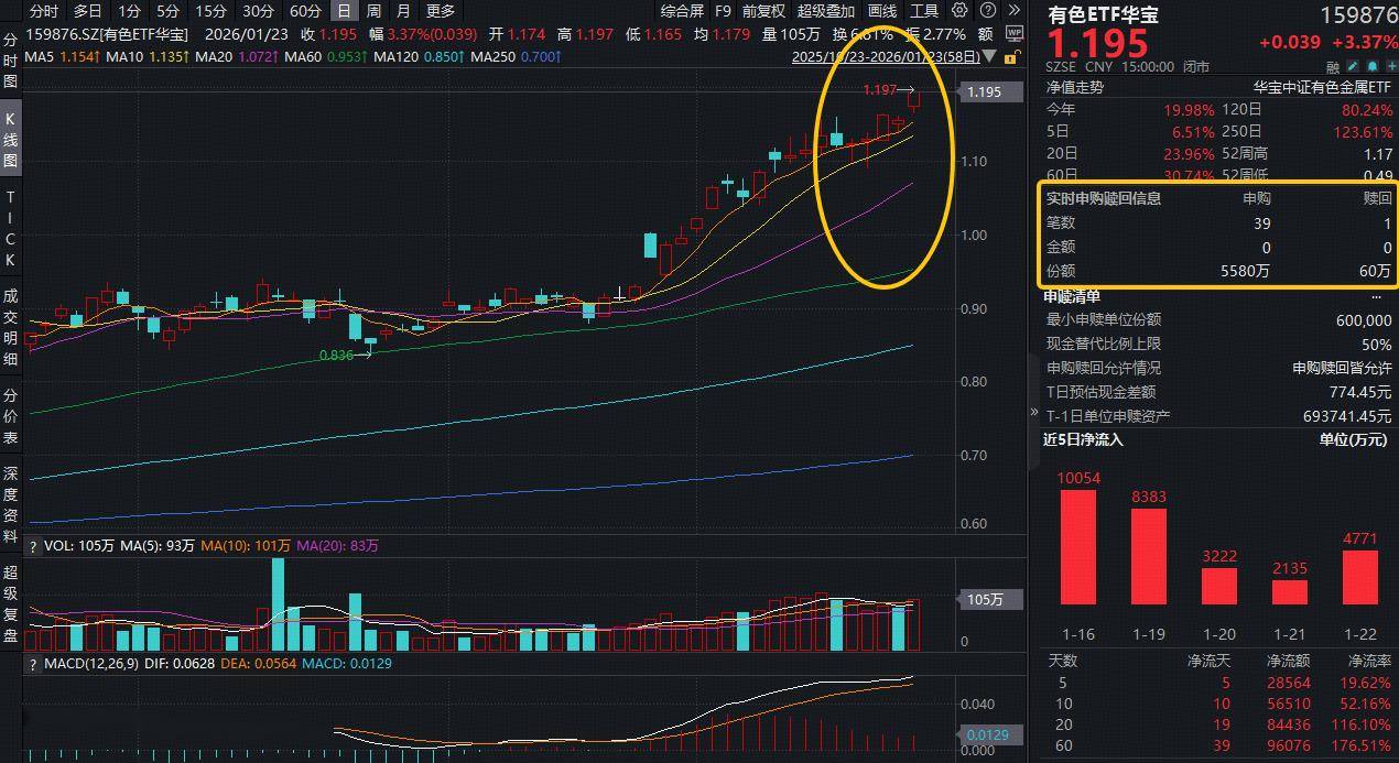 二、【猛拉3.3%!有色ETF华宝(159876)放量突破上市高点!全天获资金净申购5520份!白银有色等4股涨停!】