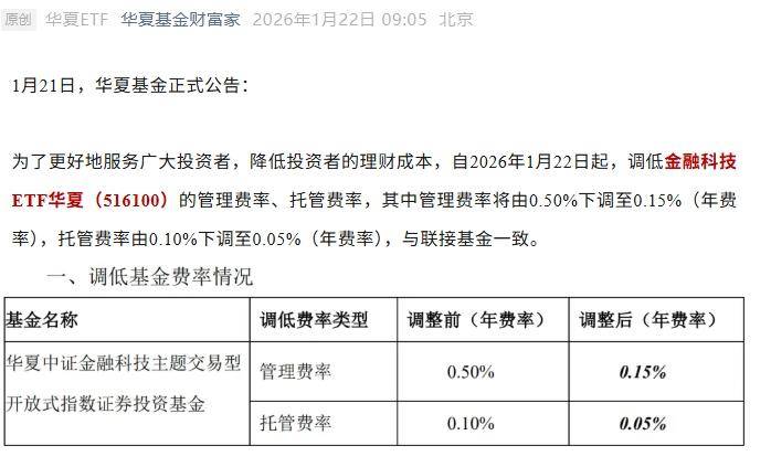 其中,华夏基金自2026年1月22日起,调低金融科技ETF华夏(516100)的管理费率、托管费率,其中管理费率将由0.50%下调至0.15%(年费率),托管费率由0.10%下调至0.05%(年费率),与联接基金一致。