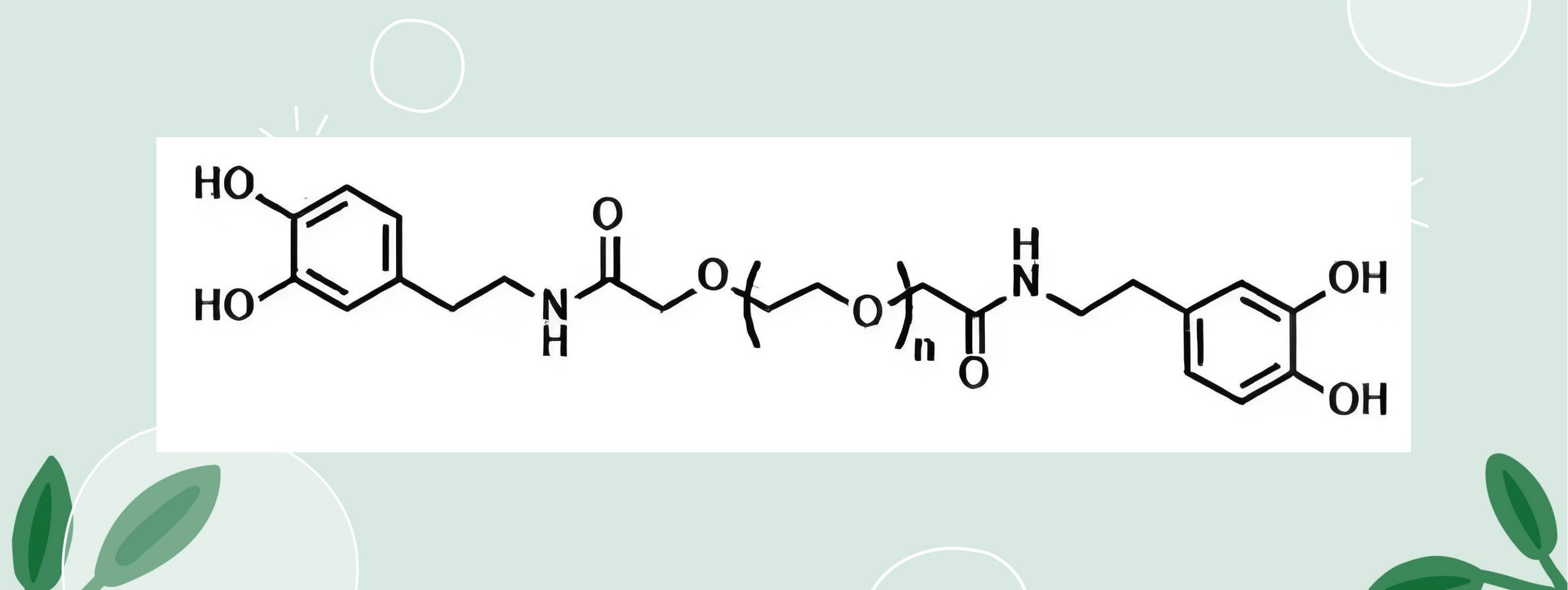 Do-PEG-Do,即聚乙二醇二多巴胺,是一种两端均由多巴胺修饰的聚乙二醇类衍生物。其化学结构独特,中间部分为聚乙二醇链段,赋予其出色的水溶性、柔韧性和生物相容性;两端的多巴胺基团则含有邻羟基苯胺基团,展现出优异的黏附性能与化学活性。该试剂外观通常为固体或粉末,可溶于大部分有机溶剂及水,便于在各种实验条件下使用。