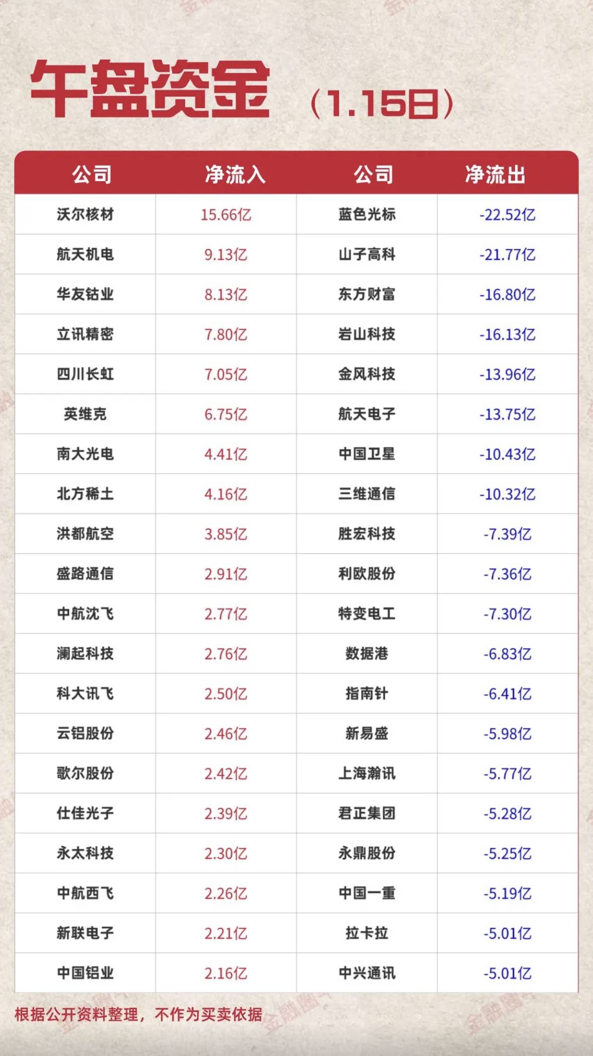 午盘资金流向分化,多股呈现净流入与净流出态势,市场资金博弈明显,需谨慎参考。