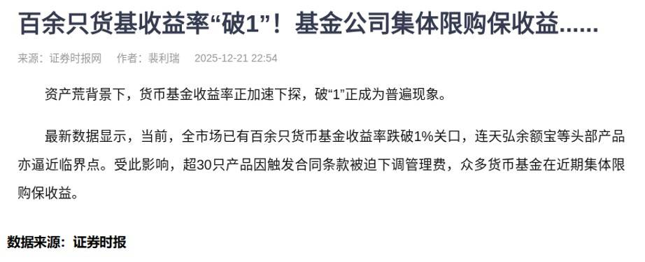 看着手机上天弘余额宝1.02%的收益率提示,我不禁想起十年前刚入行时,货币基金还能轻松跑赢通胀的日子。如今全市场123只货币基金收益率跌破1%,超过30只产品被迫下调管理费,这种“资产荒”景象让我这个量化老兵嗅到了熟悉的味道——每当现金类资产收益跌至谷底,往往意味着权益市场的机会正在酝酿。