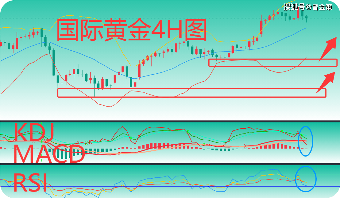❸:1小时级别上:金价高位震荡,RSI 技术指标处于超买回落状态中,MACD 死叉运行中。布林带运行平缓,短线高位震荡频率提升。